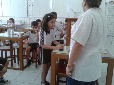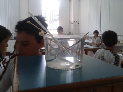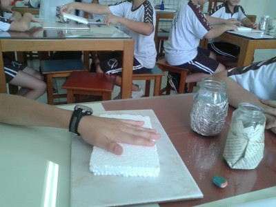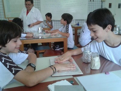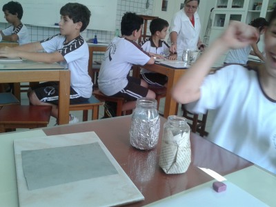Hoje, no laboratório, a tia Adriana fez experiências com objetos nos mostrando quais são bons condutores de calor e quais são isolantes térmicos. Teve até um termômetro criado por ela. Como sempre, foi fantástico.